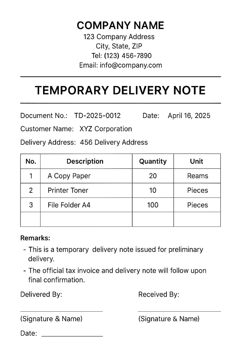Temporary Delivery Note – ใช้เมื่อการส่งของยังไม่สมบูรณ์ หรือยังไม่มีการออกใบกำกับภาษี/ใบเสร็จอย่างเป็นทางการ