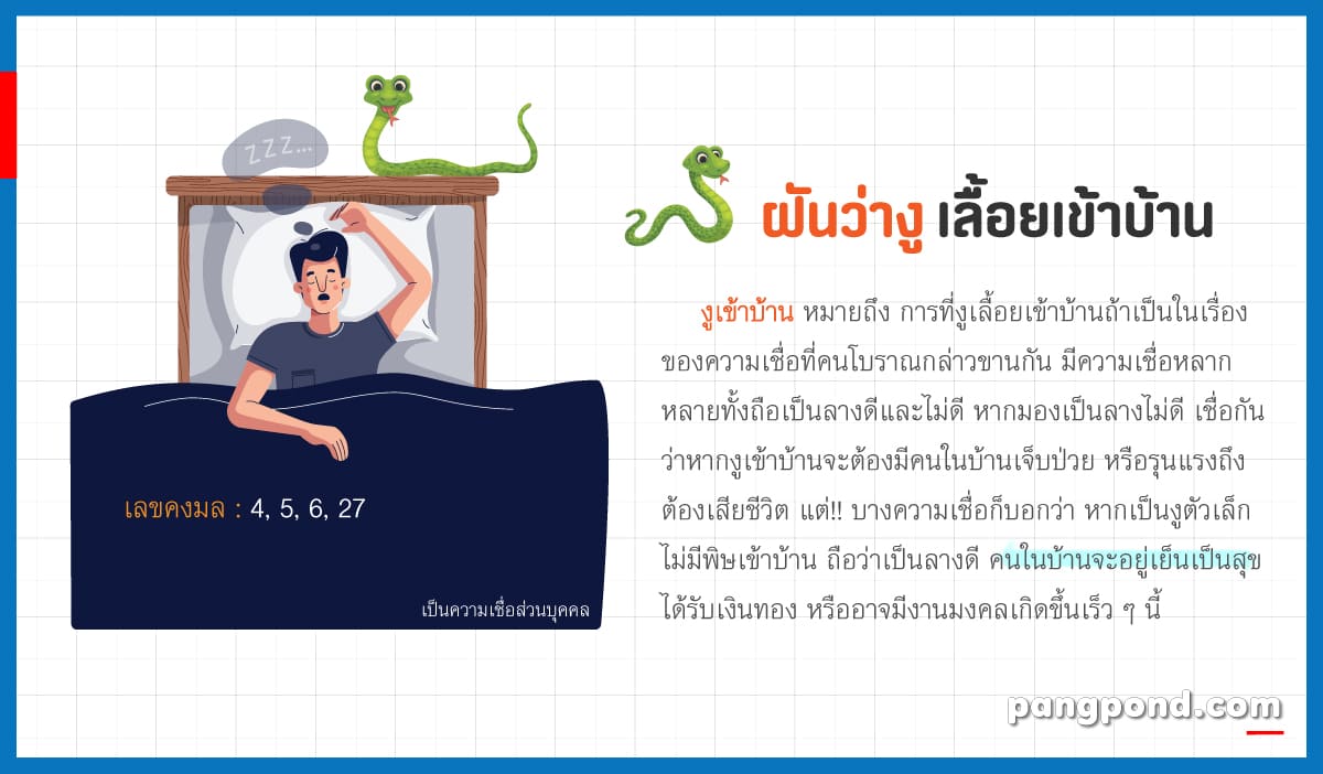 ฝันถึง งูเผือก ทำนายว่า ท่านจะได้เจอมิตรที่ดี มีโอกาสได้รับโชคดีจากทิศเหนือ ระวังเรื่องอารมณ์ความเครียดที่ส่งผลต่อร่างกาย ควรหาเวลาผ่อนคลาย อาจได้โชคจากคนผิวสองสี ควรอ่อนน้อมถ่อมตนไม่ว่าจะทำอะไร