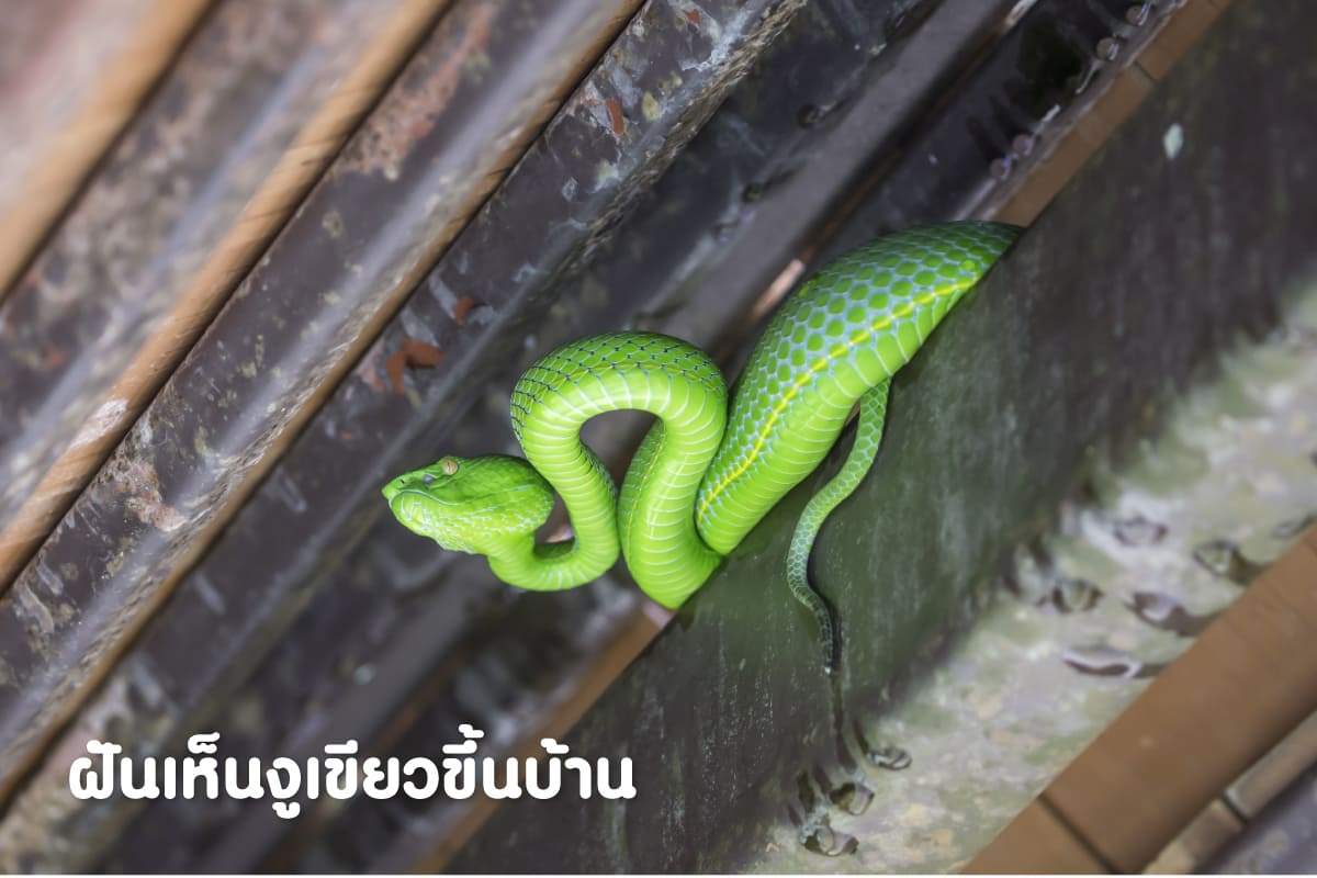ฝันเห็น งูขึ้นบ้าน งูเขียวเข้าบ้าน ทำนายว่า อาจเป็นลางร้ายอาจจะมีการทำร้ายจากคนที่อยู่ในตำแหน่งที่สูงกว่าหรือโดนกลั่นแกล้งให้ได้รับความเสียหายจากการทำงานหรือการใช้ชีวิต