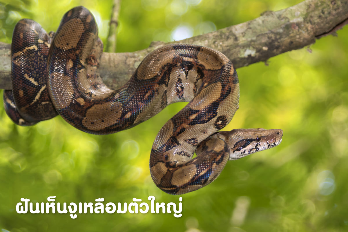 คนที่ฝันเห็น งูตัวเหลือมตัวใหญ่ อาจกำลังเผชิญกับผู้ที่มีอำนาจบางคน ภาวะกดดันบางอย่าง แต่ไม่ได้ร้ายแรงมาก เหมือนที่ลึก ๆ คุณรู้ว่างูตัวใหญ่มักจะไม่ใช่งูที่มีพิษร้ายระวังการใช้จ่ายเงิน ให้ระวังเงินขาดมือ ถูกคนทาบทามให้ไปทำงานด้วยแต่โอกาสยังไม่เหมาะ ให้เลื่อนการย้ายงานออกไปก่อน ความรักของคุณให้ระวังมือที่สาม เข้ามาแทรกกลาง สุขภาพมีโอกาสเจ็บป่วยเลือดตกยางออก