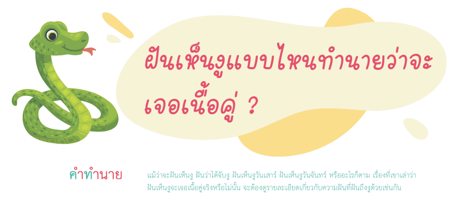 การเห็นงู คือจะเจอเนื้อคู่ คงเป็นสิ่งที่หลายๆคนได้ยินมาอย่างสม่ำเสมอ แต่รู้หรือไม่ว่า การฝันจะมีลักษณะเฉพาะ ไม่ใช่ว่าแค่เห็นงูแล้วก็จะเจอเนื้อคู่ได้นะ โดยจะต้องเป็นงูที่สัมผัสกับร่างกายของเราโดยตรง ไม่ว่าจะเป็น การรัดรอบตัว การพยายามที่จะรัด พันมือ พันแขนขา ยิ่งถ้ามารัดส่วนบนของร่างกายนั้นหมายถึงว่า คู่ของคุณจะมีฐานะดีเลยทีเดียว แต่หากไม่มีการสัมผัสกับร่างกายจะไม่ถือว่าเป็นลางบอกเหตุสำหรับเนื้อคู่ ยิ่งถ้างูอยู่เฉยๆล่ะก็ อาจหมายถึงเจ้าที่เจ้าทาง ซะมากกว่า ลืมเนื้อคู่ไปได้เลย