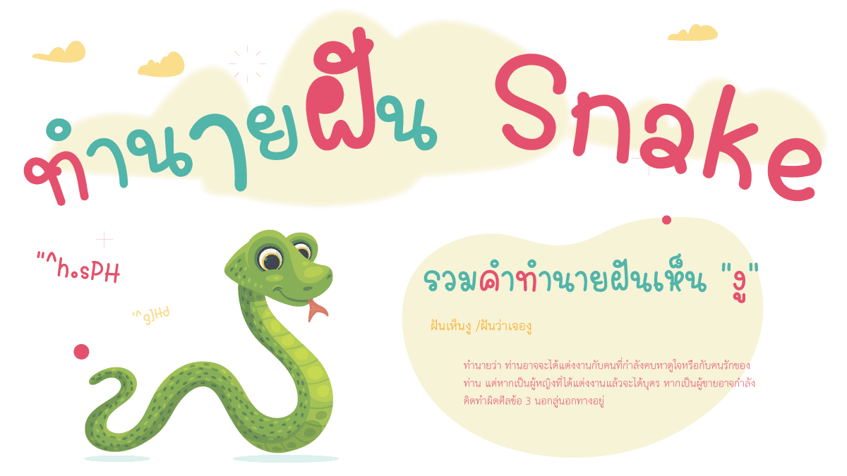 เขาว่าจะเจอเนื้อคู่จริงหรือเปล่า ? เชื่อว่าหลายคนอาจจะเคยได้ยินเกี่ยวกับประโยคนี้กันมานับไม่ถ้วน ซึ่งอันที่จริงแล้ว การฝันถึงงูนั้นก็มีหลายแบบ โดยจะสามารถทำนายฝันได้จาก “งู” ที่เราเห็น ไม่ว่าจะเป็นท่าทางของงู ขนาดของงู เช่น เห็นงูเล็ก เห็นงูเหลือมใหญ่ เห็นงูใหญ่แต่ไม่รู้งูอะไร หรือกระทั่งว่าชนิดของงูที่เห็น เช่น เห็นงูเห่า เป็นต้น นอกจากนี้สีของงู จำนวนงู และอื่น ๆ ก็อาจจนำมาทำนายฝันได้ละเอียดมากขึ้นด้วยเช่นกัน ดังนั้นไม่ใช่ทุกครั้งที่ฝันเห็นงูจะต้องเจอเนื้อคู่ไปเสียหมด เราไปดูความหมายกันเลยว่า เห็นงูแบบไหน สื่อถึงอะไรได้บ้าง