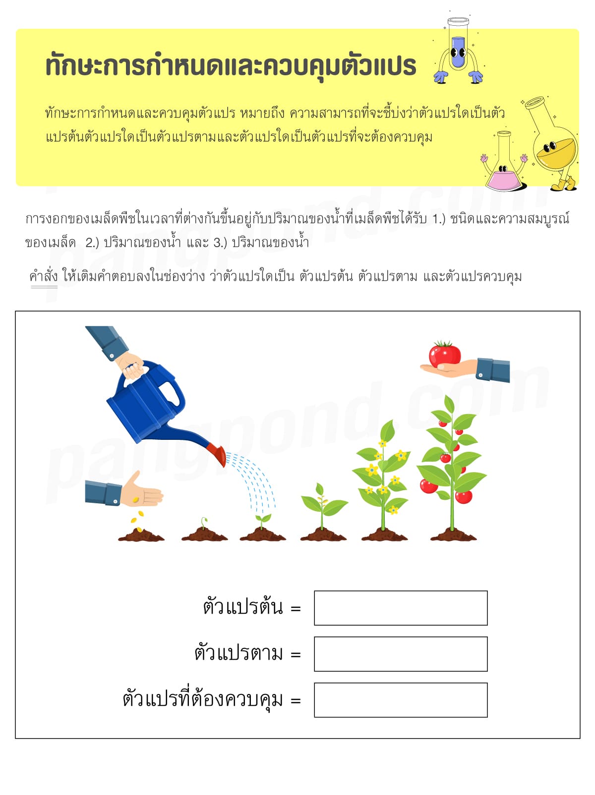 - ตัวแปรตาม = เวลาในการงอกของเมล็ดพืช