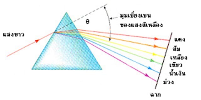 พิจารณาส่องแสงอาทิตย์ผ่านแท่งแก้วสามเหลี่ยม(ปริซึม) แสงขาวของดวงอาทิตย์นั้นมีองค์ประกอบด้วยแสงสีต่างๆ 7 สี คือม่วง คราม น้ำเงิน เขียว เหลือง แสด และแดง เมื่อผ่านปริซึม แต่ละสีจะเกิดการหักเหออกมาได้ไม่เท่ากัน สีแดงมีความยาวคลื่นมากที่สุดจะเกิดการหักเหน้อยที่สุด สีม่วงมีความยาว คลื่นน้อยที่สุดจะเกิดการหักเหมากที่สุด ส่วนสีอื่นๆ ซึ่งมีความยาวคลื่นแตกต่างกันก็จะเกิดการหักเหได้ไม่เท่ากันด้วย ลักษณะนี้จะทําให้แสงแต่ละสีที่หักเหออกมาเกิดการแยกออกจากกนัดังรูป เรียกว่า เกิดการกระจายของแสง