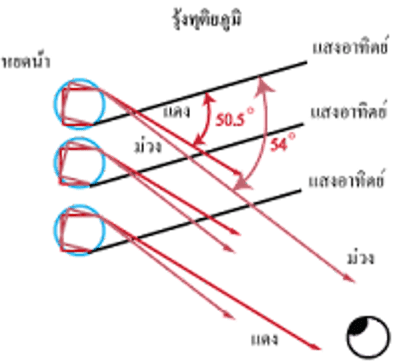 2) รุ้งปฐมภูมิ เป็ นรุ้งกินน้ำซึ่งแสงจะเกิดการสะท้อนกลับหมดภายในละอองนํ้า 1 ครั้ง รุ้งแบบนี้จะเกิดในระดับตํ่ากว่ารุ้งทุติยภูมิ แสงที่หักเหออกมาจากละอองนํ้าแต่ละละอองนั้น แสงสีม่วงจะหักเหอยู่ด้านบนสีแดง แต่สีที่มาเข้าตาเรากลับเป็นสีแดงอยู่บนสีม่วง