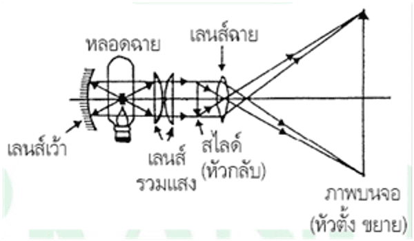 เมื่อแสงจากหลอดไฟผ่านเลนส์รวมแสงแล้วผ่านสไลด์ จากนั้นแสงจะพุ่งผ่านเลนส์ฉายภาพแล้วเกิดการหักเหไปเกิดเป็นภาพจริงหัวกลับขึ้นที่ฉากรับภาพดังรูป เนื่องจากภาพที่เกิดบนฉากเป็นภาพหัวกลับ ดังนั้นเวลาใส่ฟิล์มจึงต้องกลับหัวฟิล์มลงเพื่อให้ได้ภาพหัวตั้งขึ้นบนฉากนั่นเอง