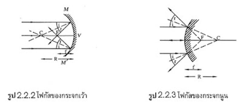 ดังรูป แต่ถ้าต่อแนวรังสีสะท้อนย้อนไปด้านหลังกระจก จะพบว่าเส้นสมมุติเหล่านั้น จะไปตัดกนที่จุดกึ่งกลางระหว่างจุด C กับจุด V ด้านหลังกระจก จุดตัดนี้เรียกว่าจุดโฟกัส (F) และระยะห่างจากจุด V ถึงจุด F เรียกความยาวโฟกัส (f) แต่เป็นจุดโฟกสและความยาวโฟกัสเสมือนเท่านั้น