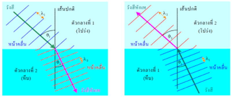 λ1 และ λ2 คือความยาวคลื่นแสงในตัวกลางที่ 1 และ 2 ตามลําดับ