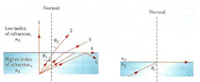 หากยิงแสงจากตัวกลางที่มีความหนาแน่นมากไปสู่ตัวกลางที่มีความหนาแน่นน้อยกว่า เช่นยิงแสงจากพลาสติกไปสู่อากาศ จะเกิดการหักเหซึ่งมุมหักเหโตกว่ามุมตกกระทบเสมอดังรูป สําหรับมุมตกกระทบที่ทําให้มุมหักเหเป็นมุม 90 องศา มุมตกกระทบนั้นเรียก มุมวิกฤติ