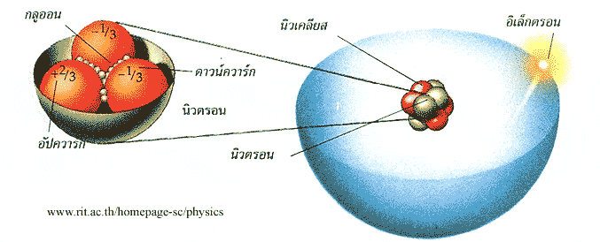 ควาร์ก  นิวตรอนกับโปรตอนประกอบด้วยอนุภาคที่เล็กกว่าเรียกว่า ควาร์ก  ซึ่งเกาะติดกันด้วยอนุภาคเล็กเรียกว่า กลูออน  “ดาวน์” ควาก์ มีประจุหนึ่งในส่ามของประจุลบ  และ  “อัป”  ควาร์กมีประจุสองในสามของประจุบวก