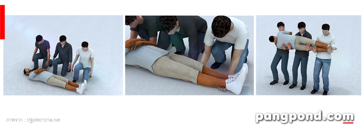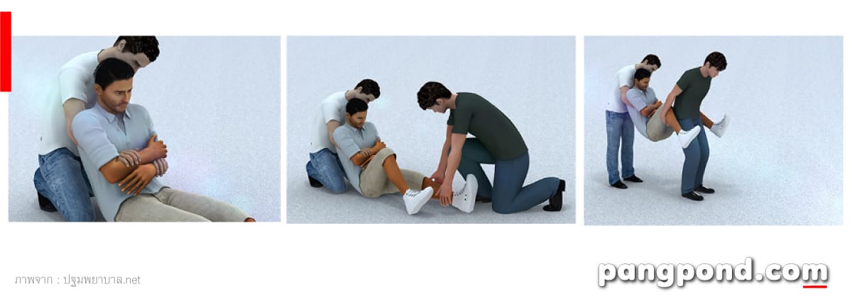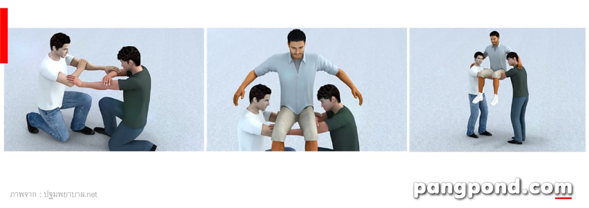 - คนที่ 3 สอดมือทั้งสองเข้าใต้ขาผู้ช่วยเหลือคนที่อ่อนแอที่สุดควรเป็นคนที่ 3 เพราะรับน้ำหนักน้อยที่สุด