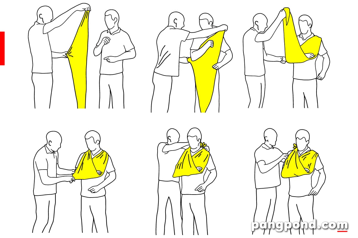- การคล้องแขน (Arm sling) ในกรณีที่มีกระดูกต้นแขนหัก หรือกระดูกปลายแขนหัก เมื่อตกแต่งบาดแผลและเข้าเฝือกชั่วคราวเรียบร้อยแล้ว จะคล้องด้วยผ้าสามเหลี่ยมตามลำดับดังนี้