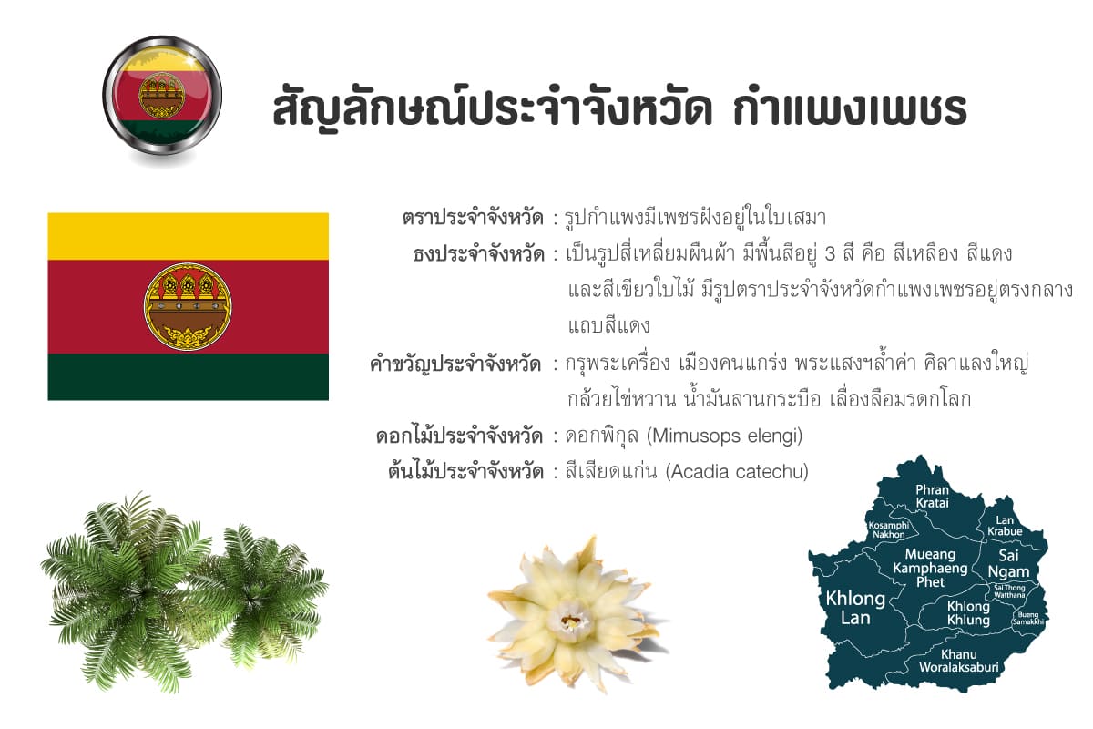 - ธงประจำจังหวัด: เป็นรูปสี่เหลี่ยมผืนผ้า มีพื้นสีอยู่ 3 สี คือ สีเหลือง สีแดง และสีเขียวใบไม้ มีรูปตราประจำจังหวัดกำแพงเพชรอยู่ตรงกลางแถบสีแดง