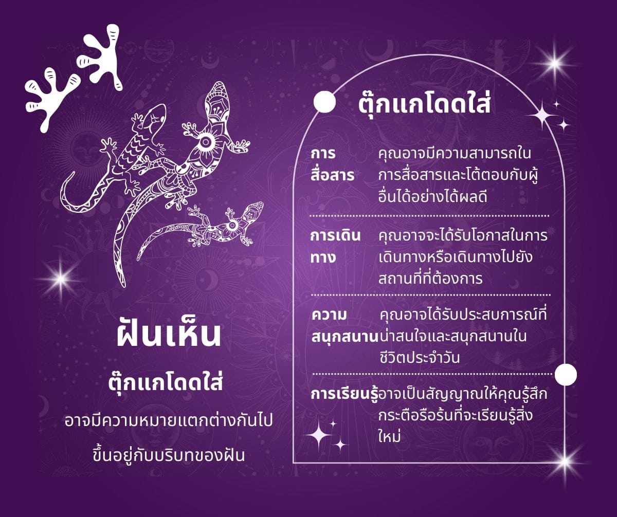 - ความสนุกสนาน การเห็นตุ๊กแกกระโดดใส่ในฝันอาจแสดงถึงความสนุกสนาน คุณอาจได้รับประสบการณ์ที่น่าสนใจและสนุกสนานในชีวิตประจำวัน