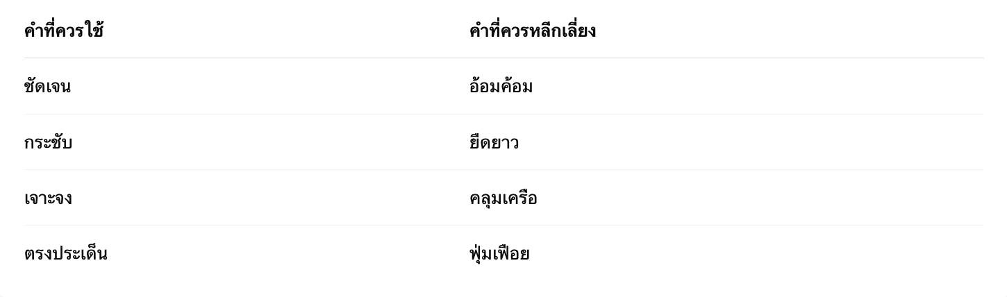 หลีกเลี่ยงการใช้คำฟุ่มเฟือยหรือภาษาที่ยืดยาวเกินจำเป็น ให้เลือกใช้คำที่ กระชับ ชัดเจน และสื่อความหมายตรงจุด