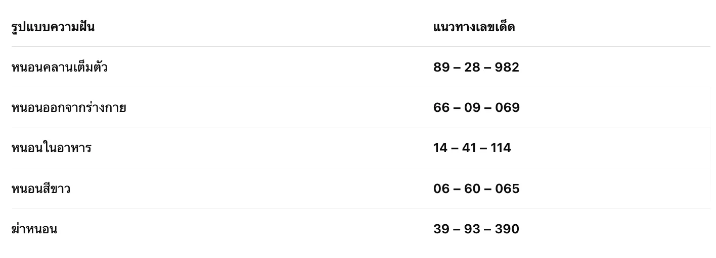 ฝันเห็นหนอน สามารถตีความได้หลายมิติ ทั้งในแง่ของโชคลาภ การเปลี่ยนแปลง หรือการชำระล้างภายในจิตใจ การตีความความฝันควรพิจารณาทั้งบริบทของความฝัน และความรู้สึกของผู้ฝันประกอบกันเสมอ