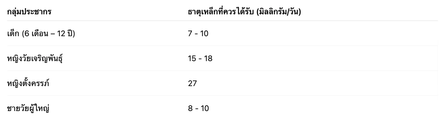 ✅ ปริมาณธาตุเหล็กที่ควรได้รับต่อวัน (ตามคำแนะนำจากกรมอนามัย)