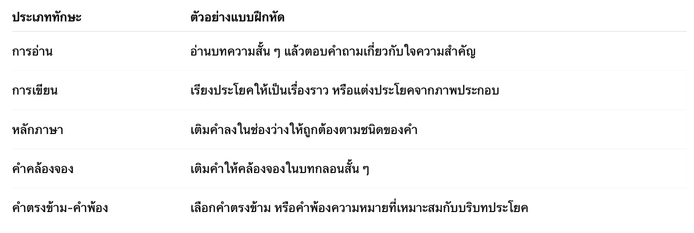 A: ควรมีความหลากหลาย ครอบคลุมทั้ง การอ่าน การเขียน หลักภาษา และคำศัพท์ พร้อมเฉลยเพื่อการตรวจสอบด้วยตนเอง