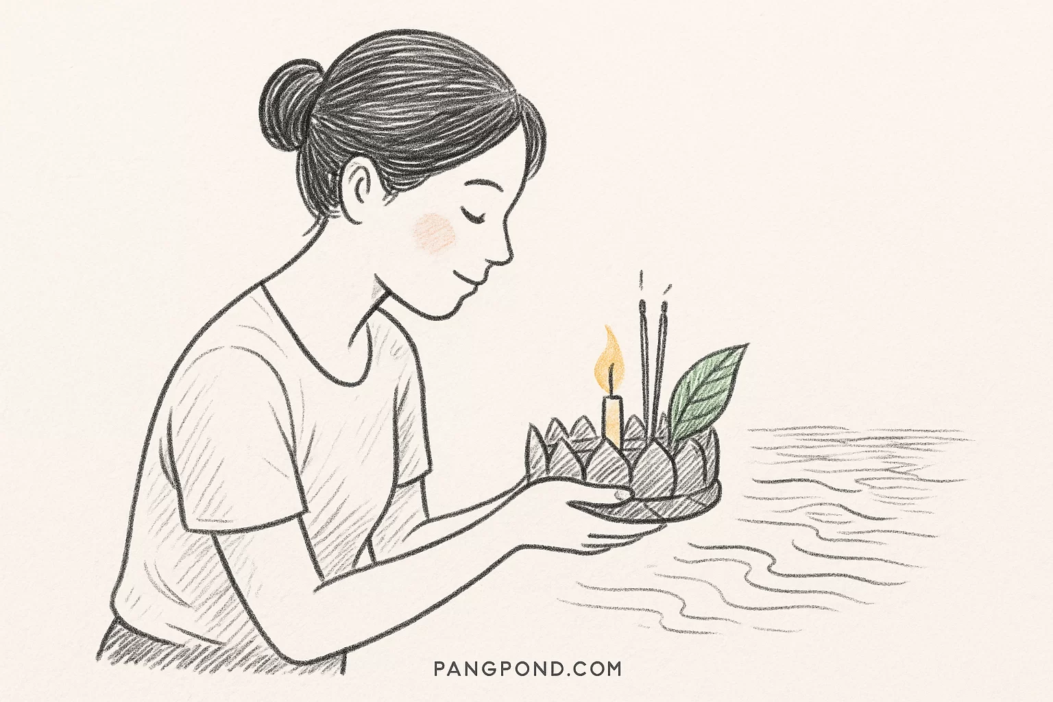“อะหัง วันทามิ สัพพะทา ข้าพเจ้าขอระลึกถึงคุณพระพุทธ พระธรรม พระสงฆ์ ขอให้สิ่งไม่ดี เคราะห์กรรมทั้งหลาย จงลอยไปตามสายน้ำนี้ ขอให้ข้าพเจ้าพ้นเคราะห์ พ้นภัย ประสบแต่ความสุข ความเจริญ ทั้งกายและใจด้วยเทอญ”
