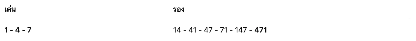 A: เลขเด่นคือ 1 4 7 ลองพิจารณาเลขอย่าง 147 หรือ 471 ซึ่งมักเป็นเลขนำโชคจากความฝันแนวนี้