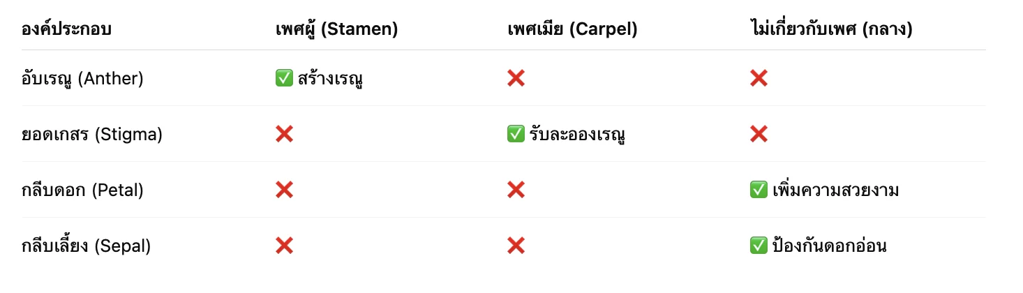 ตอบ: ไม่เสมอไป บางดอกมีเฉพาะเพศผู้หรือเพศเมีย เรียกว่า “ดอกไม่สมบูรณ์เพศ” แต่ถ้ามีครบทั้งสองเพศในดอกเดียว เรียกว่า “ดอกสมบูรณ์เพศ”
