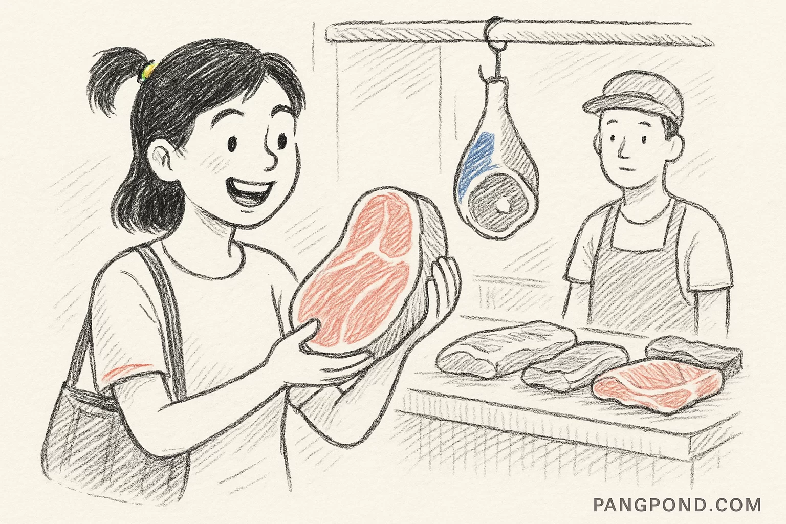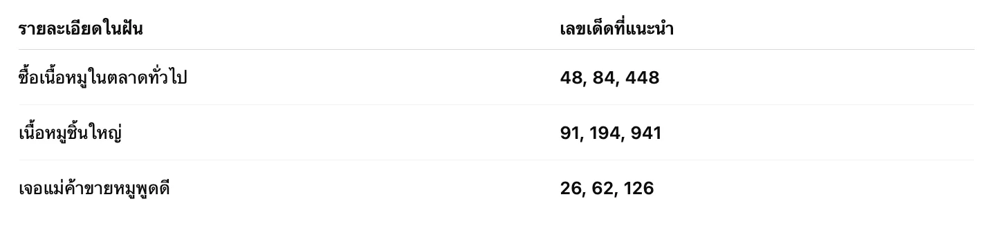 ฝันว่าเลือกซื้อเนื้อหมูชิ้นใหญ่ → มีแนวโน้มจะได้รับข่าวดีจากผู้ใหญ่ หรือโชคจากงานพิเศษ