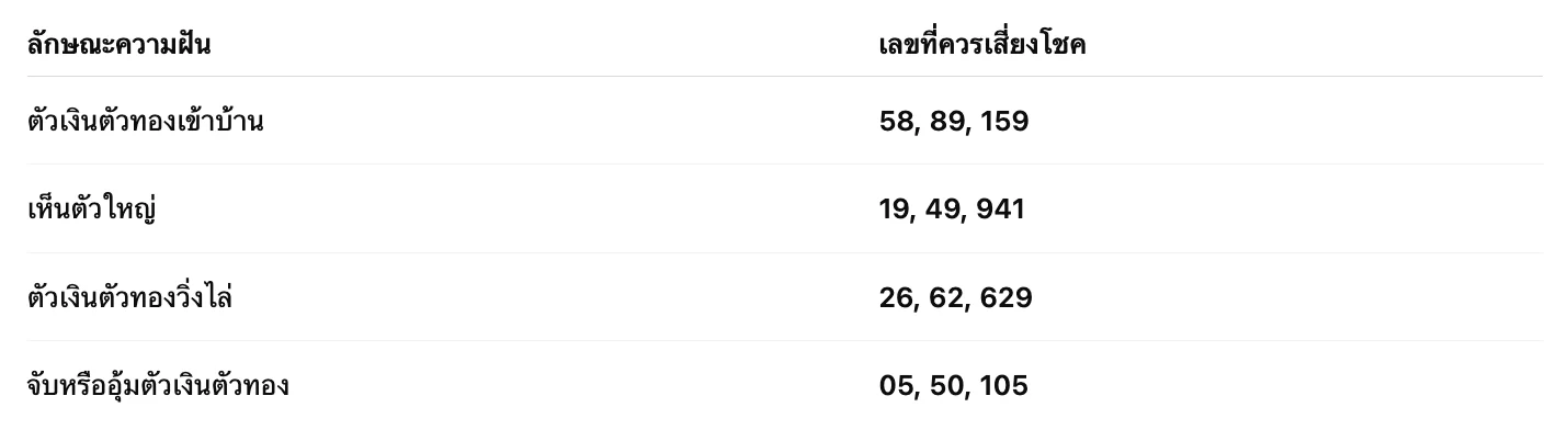 สรุป: ฝันเห็นตัวเงินตัวทอง ไม่ใช่ฝันร้าย แต่กลับเป็น สัญญาณของความโชคดี โดยเฉพาะในเรื่อง การเงิน การงาน และโชคลาภ ที่อาจกำลังเข้ามาในชีวิตคุณ ขอเพียงคุณเปิดใจ และพร้อมรับโอกาสที่ดีเหล่านั้น