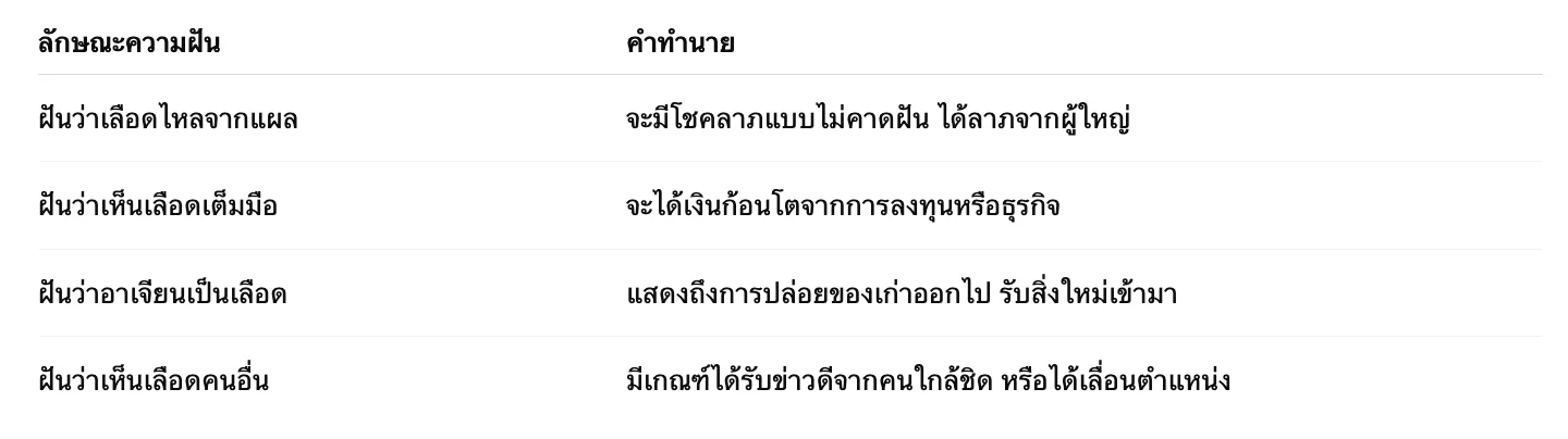 ในศาสตร์ความเชื่อ “ฝันเห็นเลือด” มักหมายถึงโชคลาภและการปลดปล่อยเคราะห์กรรม โดยเฉพาะถ้าเลือดไหลมาก ยิ่งแปลว่าโชคใหญ่กำลังจะมา นอกจากนี้ยังอาจหมายถึงการได้ ปลดเปลื้องภาระ หรือ ปล่อยวางจากสิ่งไม่ดี ที่ติดตัวมานาน