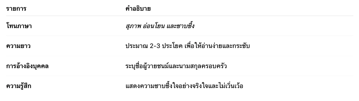 ?️ “ในนามของครอบครัว (นามสกุล) ขอกราบขอบพระคุณทุกท่านที่มาร่วมแสดงความอาลัย ณ งานสวดอภิธรรมศพ คุณ (ชื่อผู้วายชนม์) มา ณ โอกาสนี้เป็นอย่างสูง”