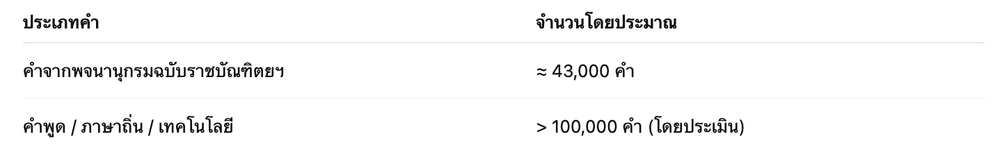 ✅ ดังนั้น หากรวมคำที่ใช้นอกพจนานุกรมเข้าไป ภาษาไทยอาจมีคำมากกว่าหนึ่งแสนคำได้อย่างไม่ยากเย็น