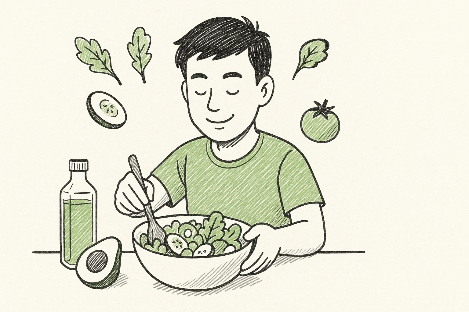 - ส่วนผสม: ผักกาดหอม, มะเขือเทศ, แครอท, แตงกวา, น้ำมันมะกอก, น้ำมะนาว